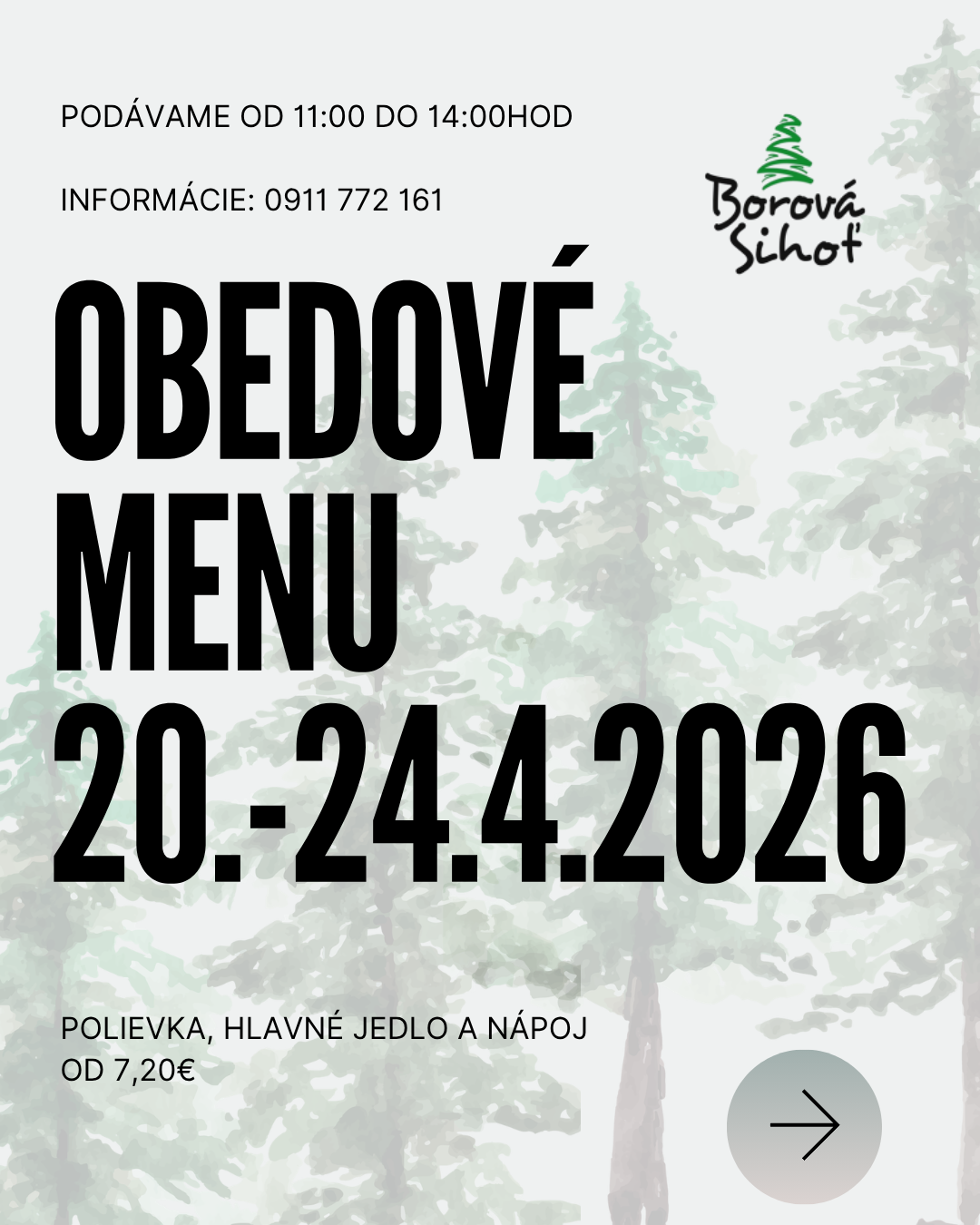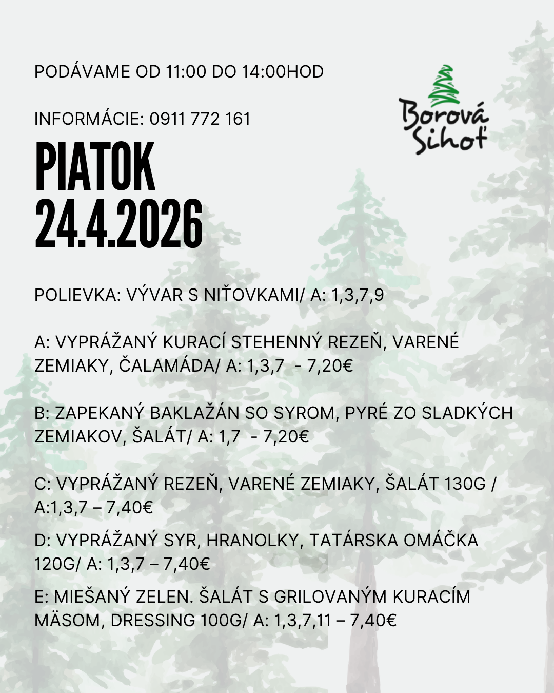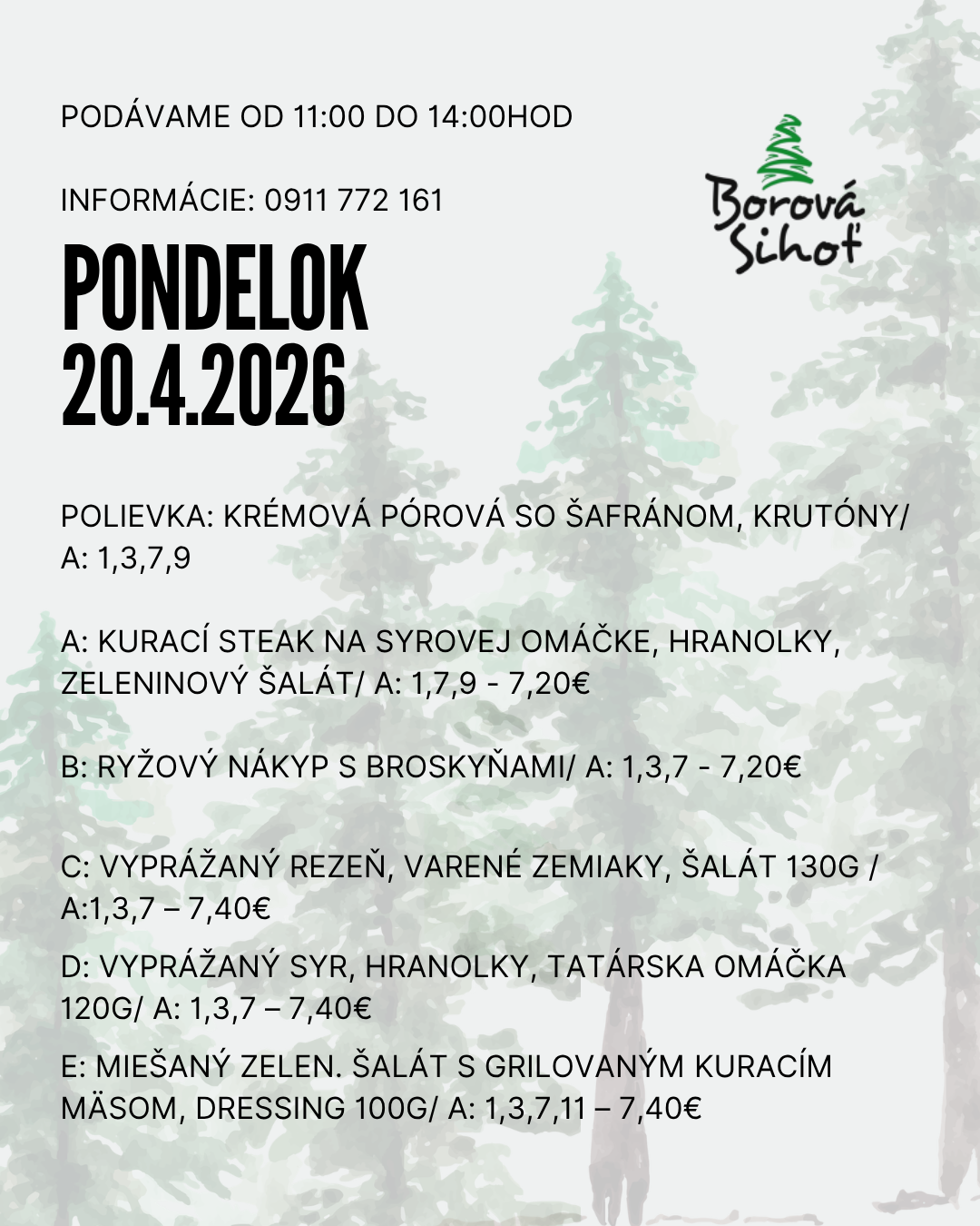 Obedové menu 06/04/2026 Vytlačiť Aj tento týždeň pre vás varíme poctivé obedové menu z čerstvých surovín. Každý deň iné domáce jedlá, tradičné chute, veľké porcie a príjemná atmosféra Borovej Sihote. Zastavte sa na rýchly a chutný obed na Liptove – radi vás obslúžime. PONDELOK UTOROK STREDA ŠTVRTOK PIATOK Pondelok 20.04.2026 Utorok 21.04.2026 Streda 22.04.2026 Štvrtok 23.04.2026 Piatok 24.04.2026