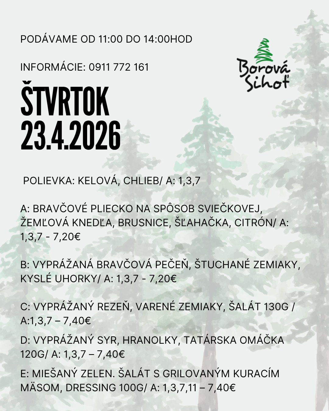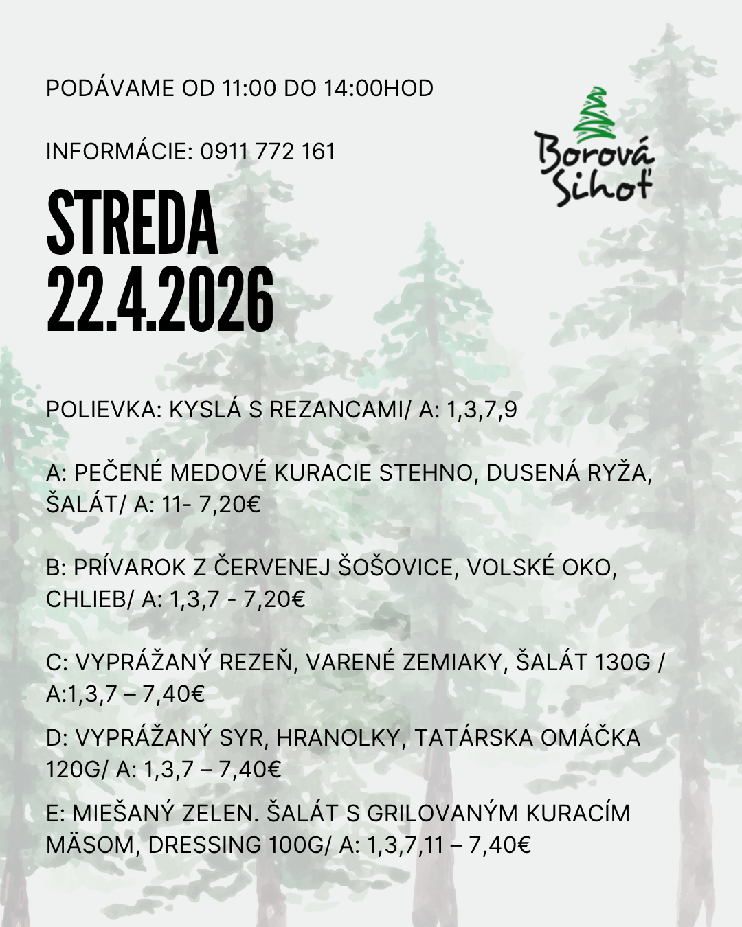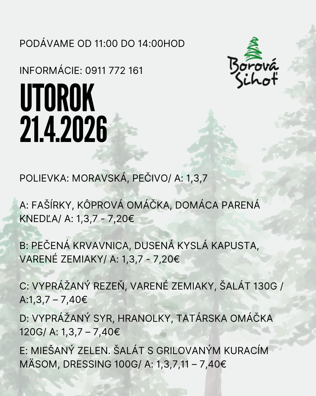 Obedové menu 06/04/2026 Vytlačiť Aj tento týždeň pre vás varíme poctivé obedové menu z čerstvých surovín. Každý deň iné domáce jedlá, tradičné chute, veľké porcie a príjemná atmosféra Borovej Sihote. Zastavte sa na rýchly a chutný obed na Liptove – radi vás obslúžime. PONDELOK UTOROK STREDA ŠTVRTOK PIATOK Pondelok 20.04.2026 Utorok 21.04.2026 Streda 22.04.2026 Štvrtok 23.04.2026 Piatok 24.04.2026
