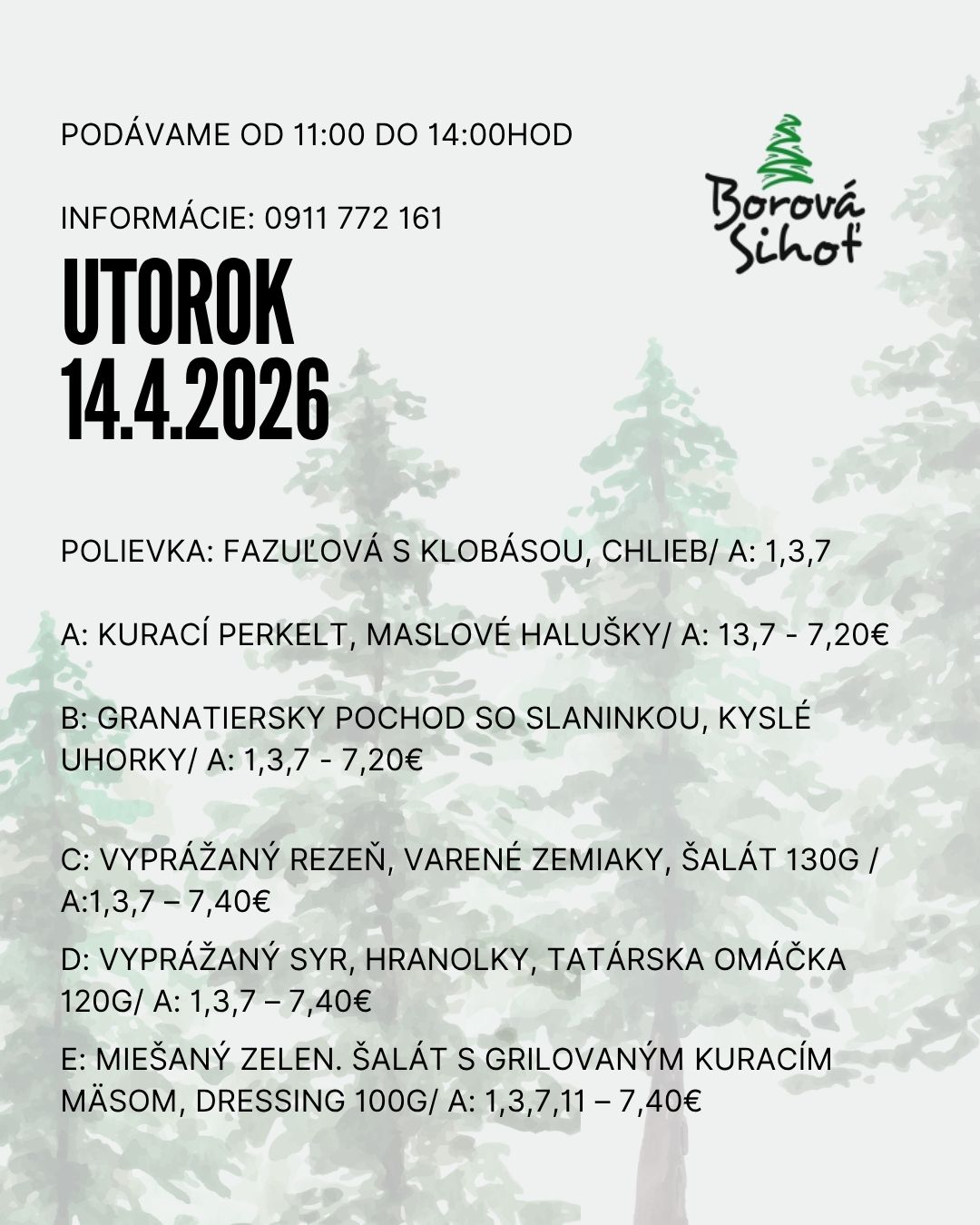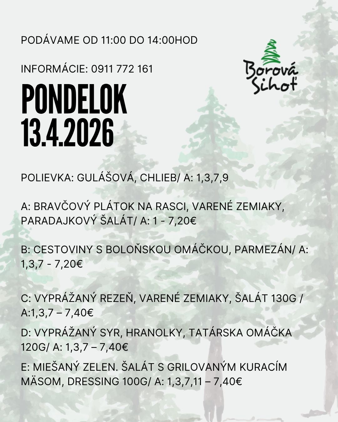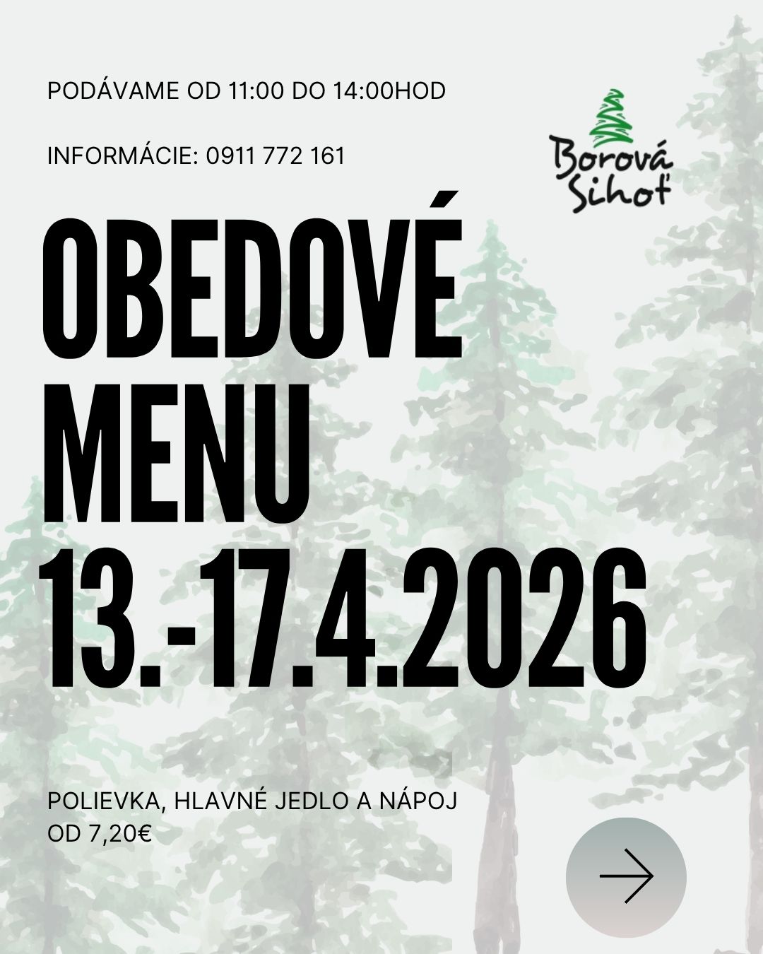 Obedové menu 06/04/2026 Vytlačiť Aj tento týždeň pre vás varíme poctivé obedové menu z čerstvých surovín. Každý deň iné domáce jedlá, tradičné chute, veľké porcie a príjemná atmosféra Borovej Sihote. Zastavte sa na rýchly a chutný obed na Liptove – radi vás obslúžime. PONDELOK UTOROK STREDA ŠTVRTOK PIATOK Pondelok 13.04.2026 Utorok 14.04.2026 Streda 15.04.2026 Štvrtok 16.04.2026 Piatok 17.04.2026