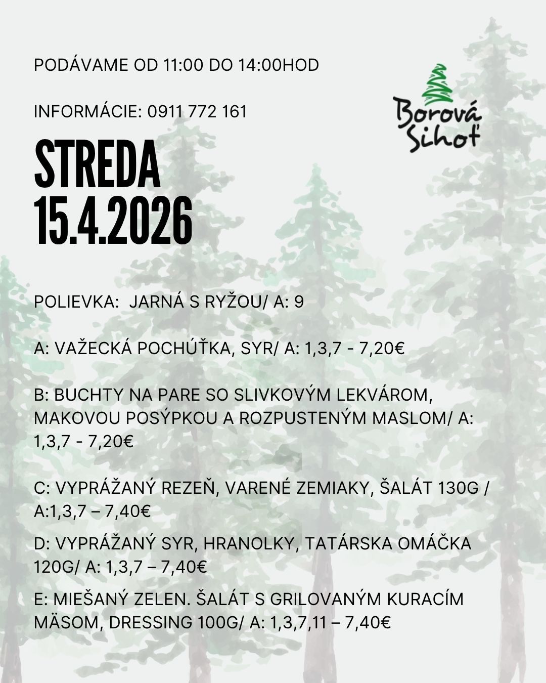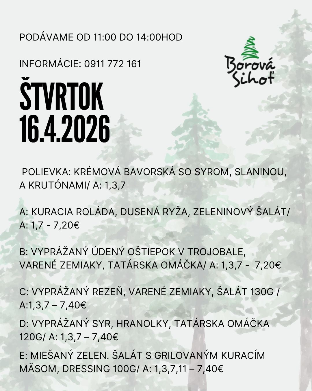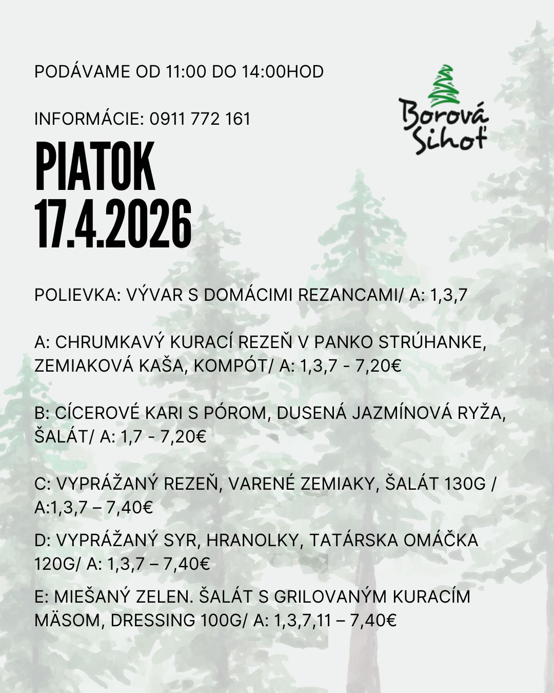 Obedové menu 06/04/2026 Vytlačiť Aj tento týždeň pre vás varíme poctivé obedové menu z čerstvých surovín. Každý deň iné domáce jedlá, tradičné chute, veľké porcie a príjemná atmosféra Borovej Sihote. Zastavte sa na rýchly a chutný obed na Liptove – radi vás obslúžime. PONDELOK UTOROK STREDA ŠTVRTOK PIATOK Pondelok 13.04.2026 Utorok 14.04.2026 Streda 15.04.2026 Štvrtok 16.04.2026 Piatok 17.04.2026
